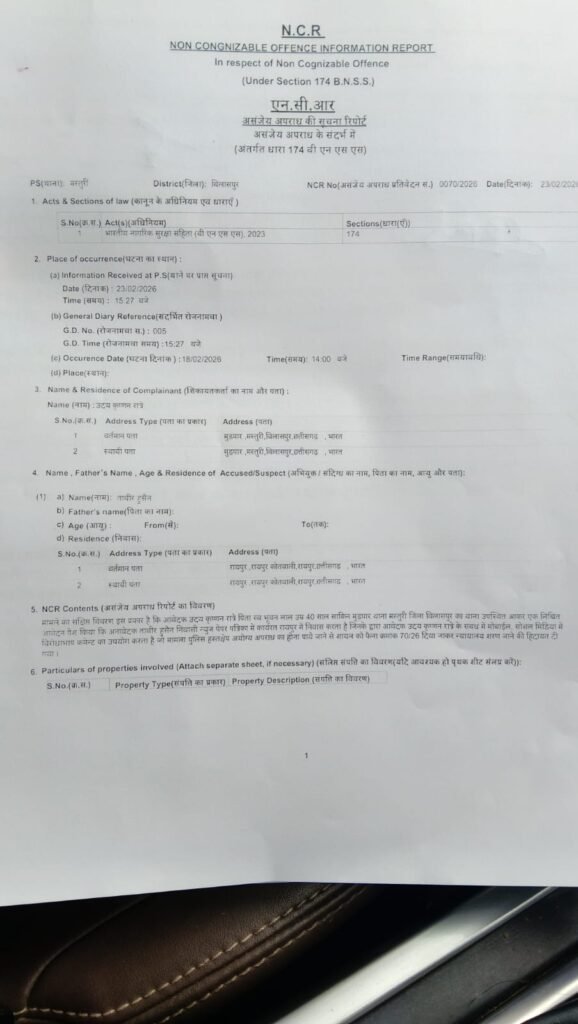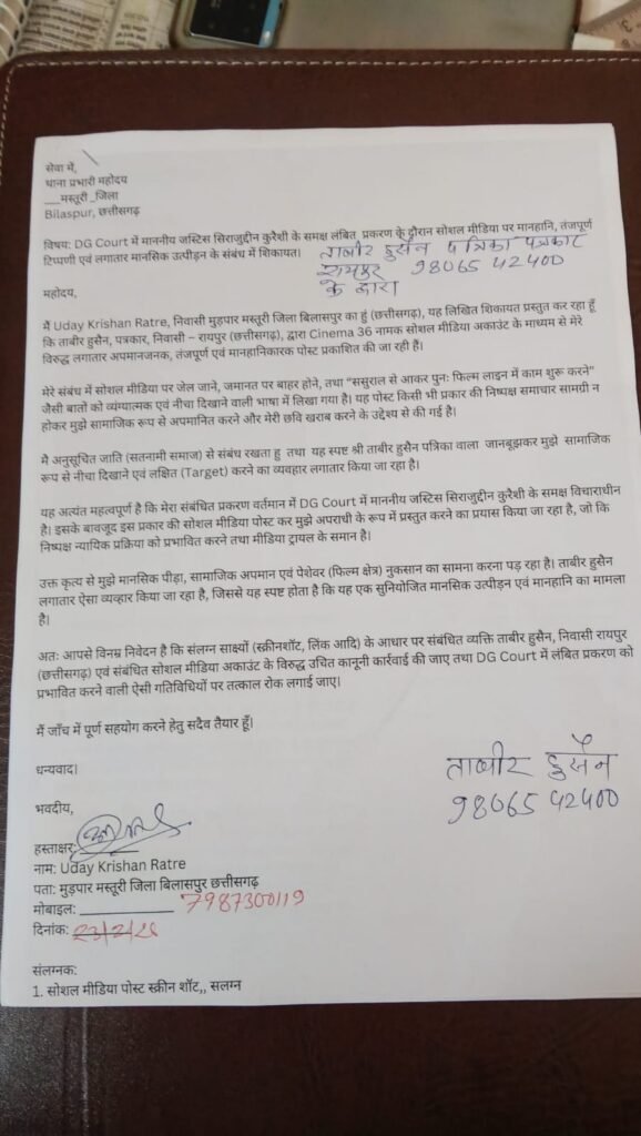 रायपुर। सोशल मीडिया पर कथित आपत्तिजनक और मानहानिकारक पोस्ट को लेकर एक नया विवाद सामने आया है। मस्तूरी क्षेत्र निवासी उदय किशन रात्रे ने आरोप लगाया है कि उनके खिलाफ लगातार भ्रामक और अपमानजनक सामग्री प्रसारित की जा रही है, जिससे उनकी सामाजिक प्रतिष्ठा और पेशेवर छवि को नुकसान पहुंच रहा है।